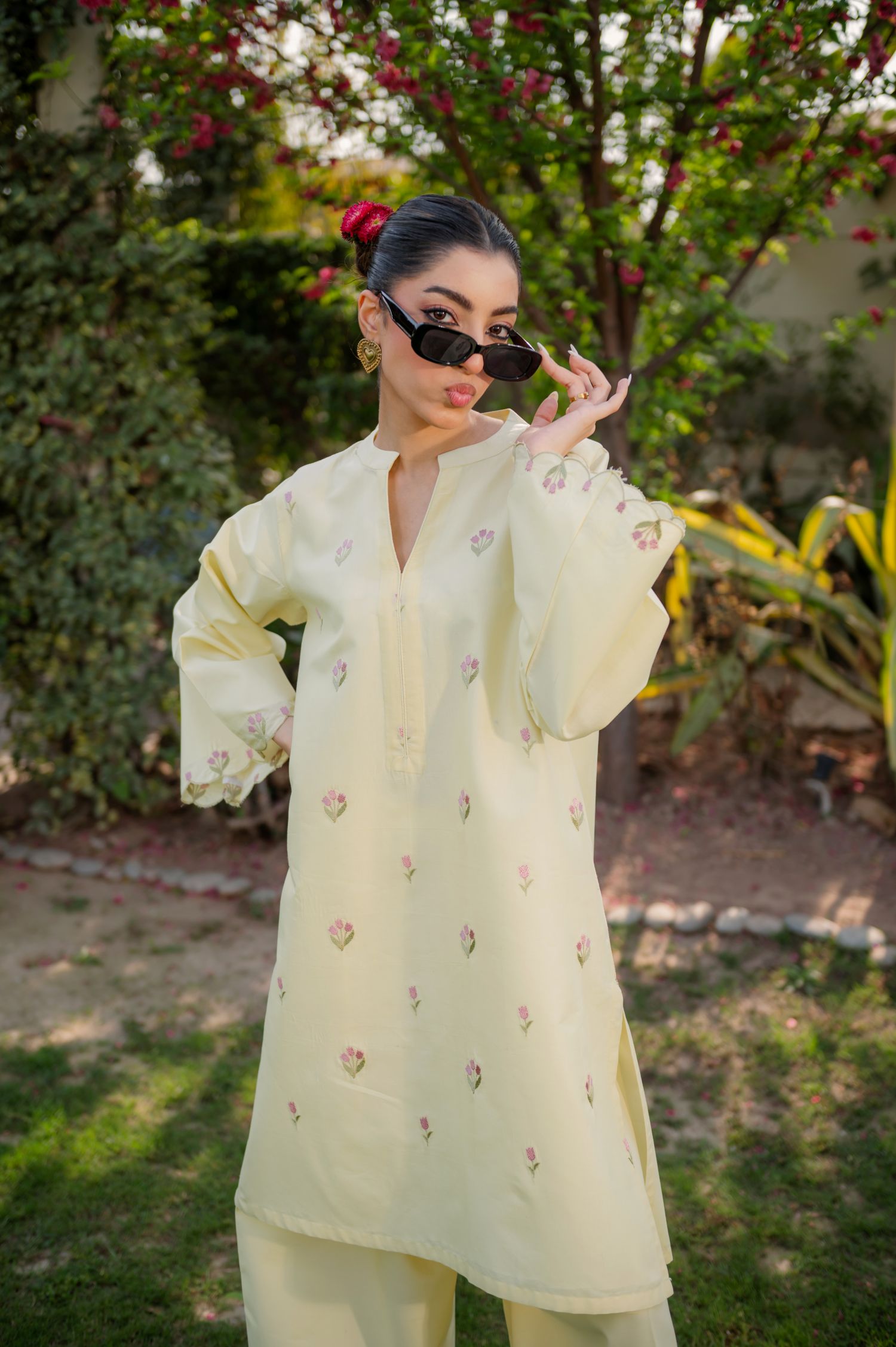 The shirt is decorated with all-over floral embroidery across the front and features beautiful embroidery on the sleeves. To pull the whole look together, the wide-leg shalwaar also has matching embroidery at the ends. Finished with a stylish scalloped edge on the sleeves and trousers, this two-piece set is perfect for everyday wear or a casual day out. For added comfort and style, the shirt also includes side pockets.